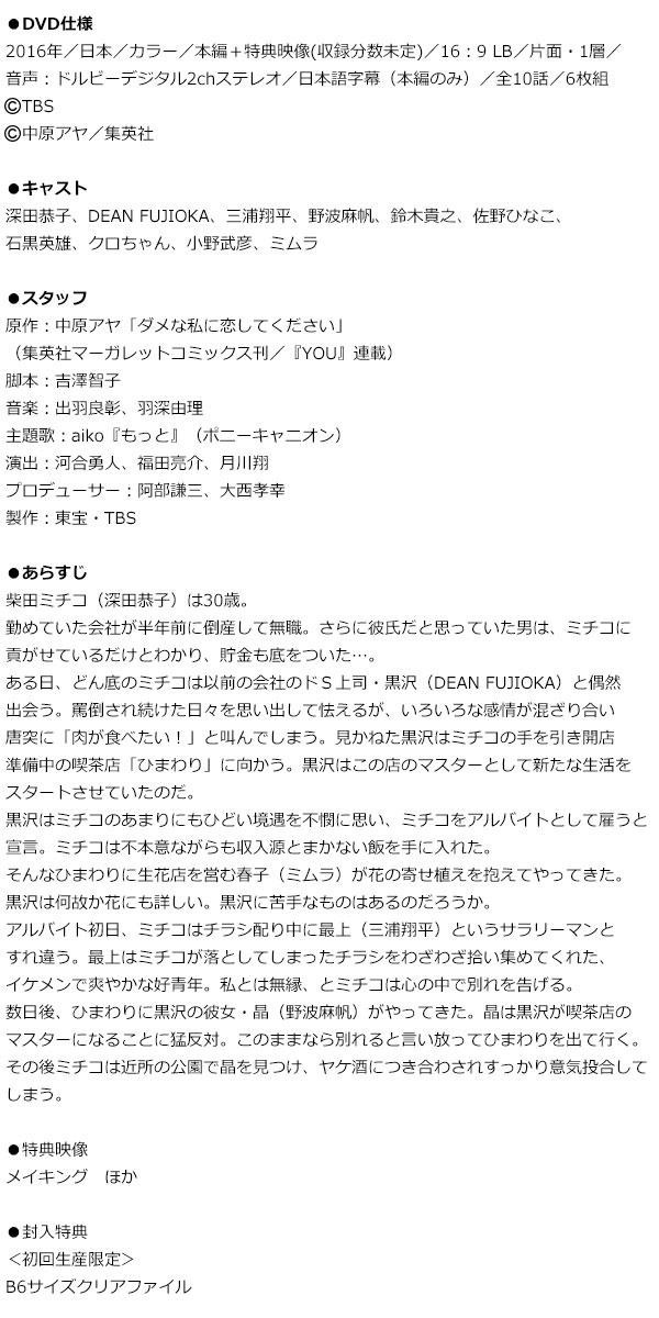 | 主人公の柴田ミチコは30歳独身彼氏なし。勤めていた会社が突如倒産して職もなし。稼いだお金を全て貢いでいたため貯金もなし…。そんなナイナイ尽くしのダメ女・ミチコを演じるのは、女優・深田恭子。そして、ミチコを見かねてアルバイトとして拾う喫茶店マスター(ドSな元上司)黒沢歩役は、俳優・DEAN FUJIOKA。さらには、三浦翔平・野波麻帆・ミムラという演技派が脇を固める。 |