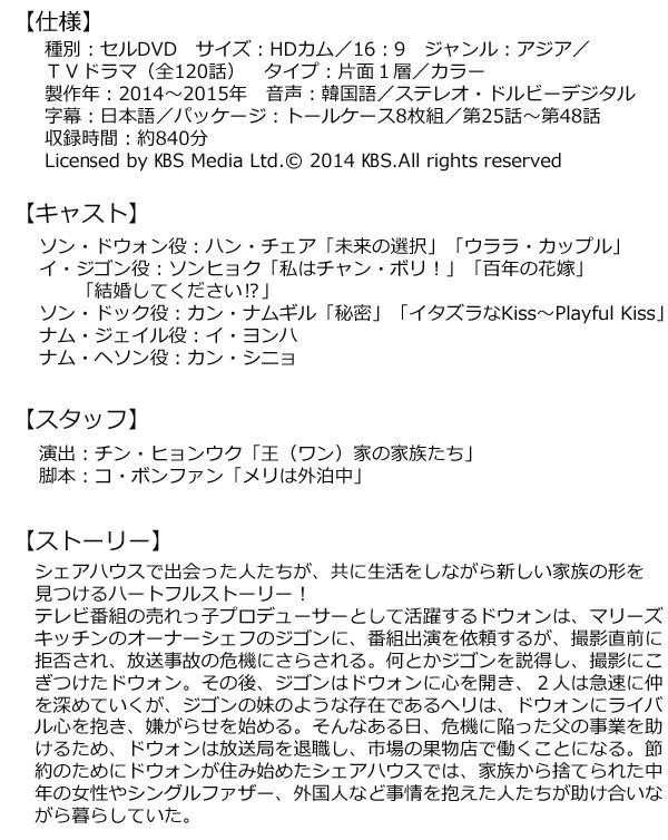 | 「王(ワン)家の家族たち」の演出家チン・ヒョンウクと「メリは外泊中」の脚本家コ・ボンファンがタッグを組んだ話題作!!「未来の選択」のハン・チェア、「私はチャン・ボリ!」のソンヒョク主演!!今話題のシェアハウスが舞台のラブストーリー!! |