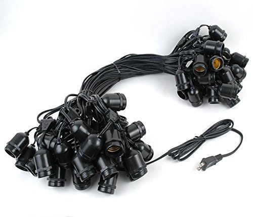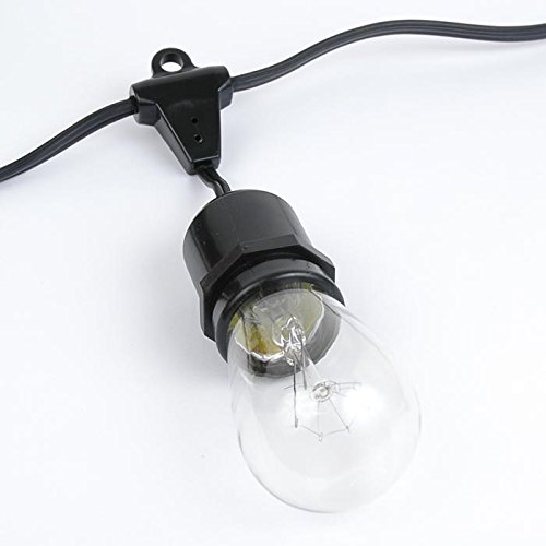 E26 medium base string 100' long with 50 suspended sockets and 50 S14 11 watt Clear bulbs. Our S14 bulb is commonly referred to as an Edison bulb because of its shape and screw in medium base. Make any patio, pergola, restaurant, or special event radiant with our outdoor string lights.