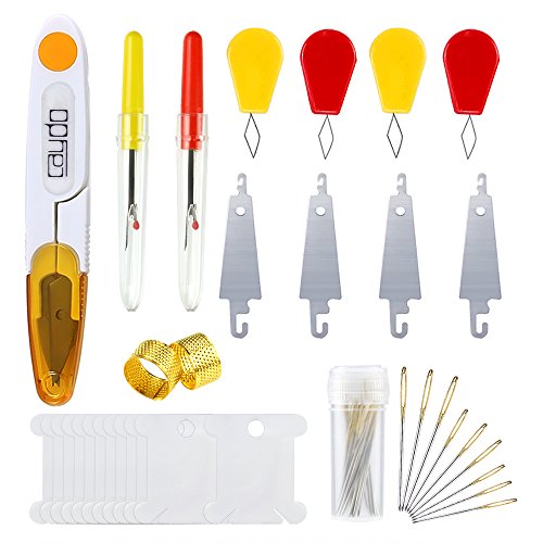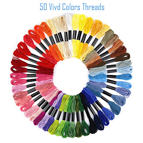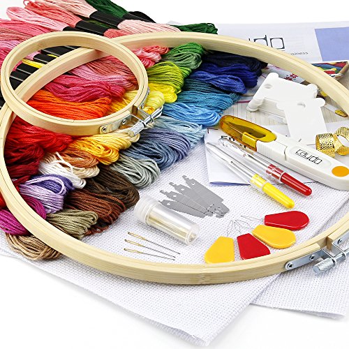- Package Content: 2pcs bamboo embroidery hoops, 50 color threads, 2pcs 14 count 12 by 18-inch white cotton classic reserve aidas, 30pcs 3 sizes embroidery needles, 12pcs floss bobbins, 8pcs cross stitch needle-threading tools, 2pcs thimble, 2pcs untwist tool, 1pcs scissors, 1pcs instructions