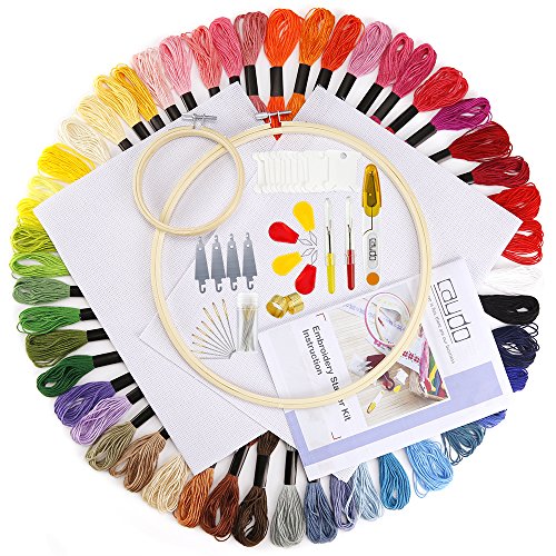 Caydo Embroidery Starter Kit with Operating Instructions for Adults and Kids, Including 2 Pieces Bamboo Embroidery Hoops, 50 Color Threads, 2 Pieces Aida and Cross Stitch Tool Kits