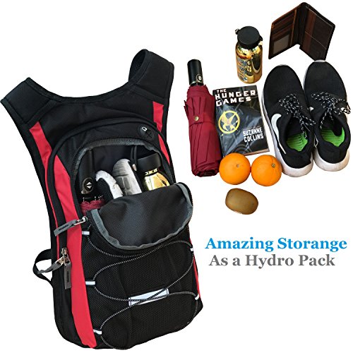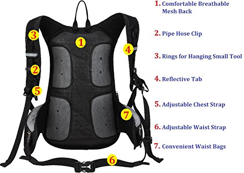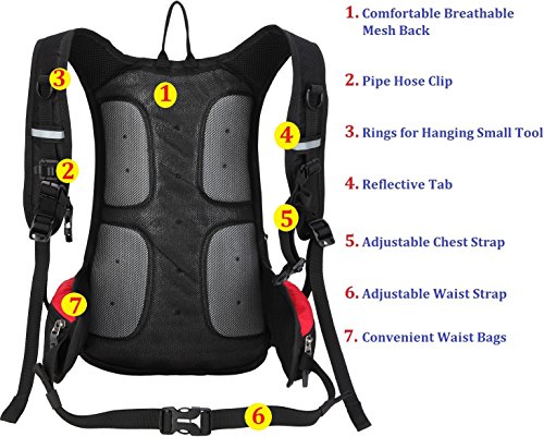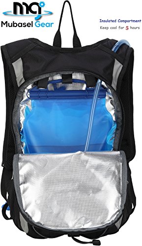 -. Feature : 1.PERFECT SET - Included 70-Ounce (2 Liter) BPA FREE FDA APPROVED food grade hydration bladder, test report will be sent to your e-mail / 2.THERMAL INSULATION - With the insulated bladder compartment, your drink can be kept cool for up to 5 hours, that's cool! / 3.GOOD VOLUME - Includes 3 storage compartments that will fit your clothes, keys, purses, phones etc. the front stretch mesh pockets allows you to pack even more on your hike / 4.100% LEAKAGE PROOF DESIGN -The opening is large design, you will never be bothered to dry the bladder as the screw one, just bottom up, it will dry itself, with click in connection instead of traditional screw one, it will never get loose and causing leakage / PERFECT OUTDOOR GEAR: Padded shoulder straps, breathable system and lightweight design are the perfect tool for outdoor sports, Mubasel Gear offer 60 days 100% Satisfaction Guarantee of the pack and free replacement of the bladder.