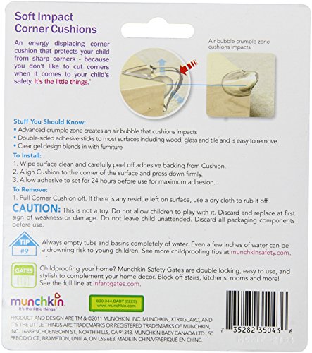 ReleaseDate : 2012-08-08 Studio : Munchkin Publisher : Munchkin Binding : Baby Product Product Description Protect your child from harmful sharp corners with Munchkin XTRAGUARD soft impact corner cushions. These 4 rounded cushions are designed to wrap around the corners of a piece of furniture to offer true corner protection. An internal bubble/crumple zone collapses under impact to absorb energy. Installation is quick and simple and the included adhesive removes easily without damage furniture. Great for use all over the home, these corner cushions are ideal for use on tables, counters and shelves. 0