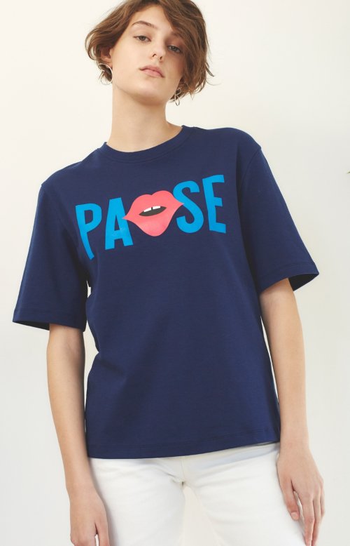 앞면에 누보텐이 개발한 PAUSE 프린트와 그래픽이 프린트 된 코튼티셔츠 입니다.