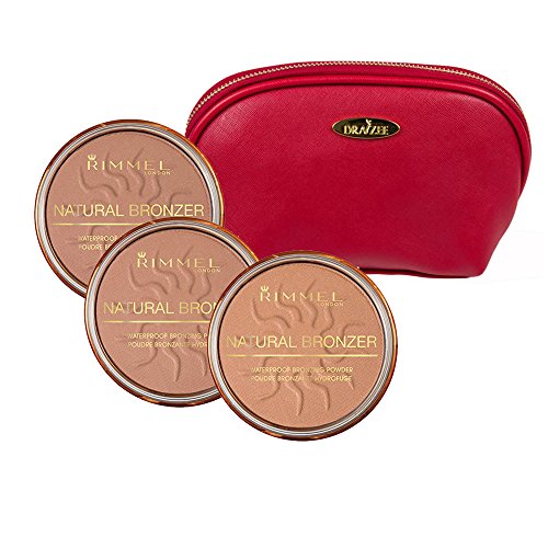 Rimmel Natural Bronzers Kit in Three Shades 0.49 Ounces Each; Sun Bronze, Sunshine and Sun Light with Deep Red Draizee Leather Cosmetic Bag
