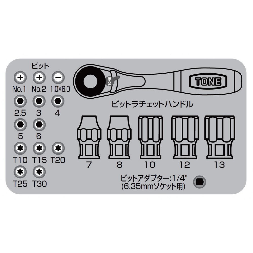 A set of fulfilling contents containing 20 items of ratchet, socket, bit in a compact resin case.