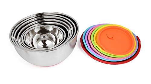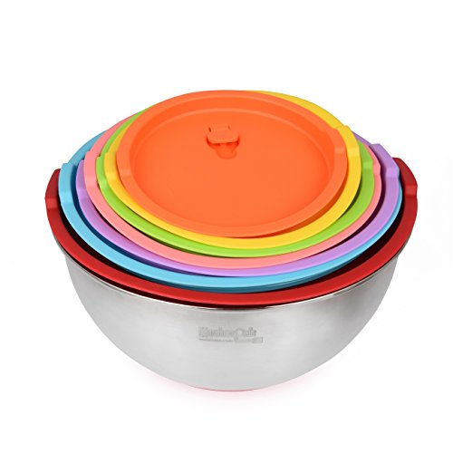 Mixing Bowl Super Set With Lids - Stainless Steel, Nesting for Easy Storage, Non-Slip Silicone Bottom, 7 Polished Mirror Finish Bowls - Bonus Whisk & Spatula (by KitchenPalz)