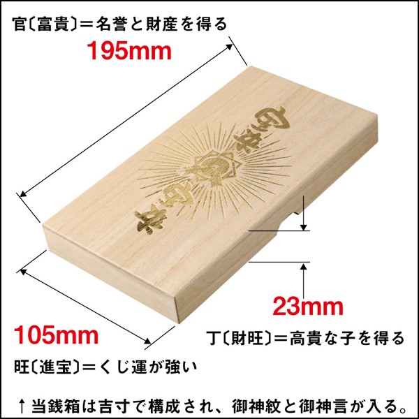 宝くじ神社と名高い「宝来宝来神社」監修当銭箱!今年のサマージャンボ宝くじにはこれ!!当銭小判がさらにパワーをアップ!!購入した宝くじを保管する場所って決めてますか? もしお決まりでなかったら、今年こそは!と思っていらっしゃる方にぜひおすすめ!■当銭箱サイズ:(約)105×195×23mm、重さ78g