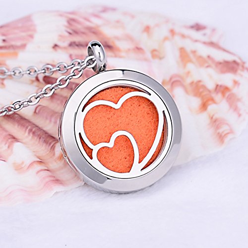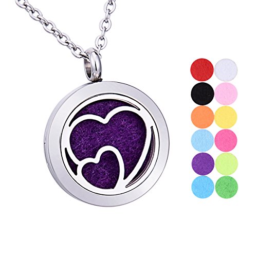 Double Hearts Aromatherapy Essential Oil Diffuser Necklace Stainless Steel Round Locket Pendant 24" Chain,12 Refill Pads