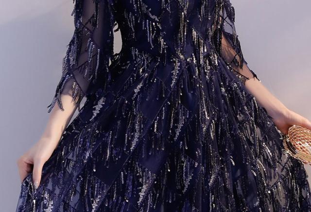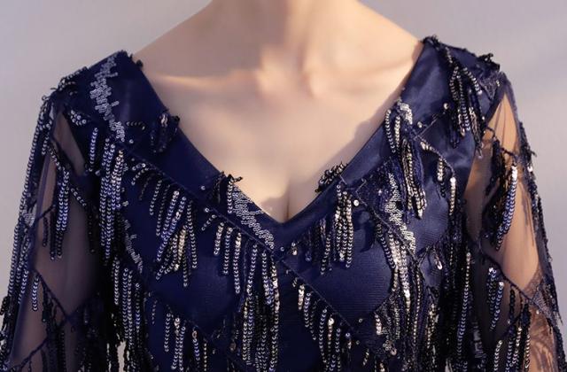 ビーズフリンジ万遍なく付くフレアシルエットパーティードレス。