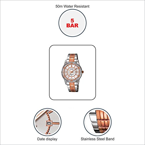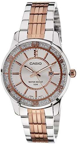 Brand, Seller, or Collection Name:Casio Model number:LTP-1358RG-7AVDF (A896) Part Number:LTP-1358RG-7AVDF (A896) Model Year:2017 Item Shape:Round Dial window material type:Mineral Display Type:Analog Clasp:Deployment-clasp-with-push-button Case material:Stainless steel Case diameter:39.5 millimeters Case Thickness:10 millimeters Band Material:Stainless Steel Band length:Women's Standard Band width:18 millimeters Band Color:Rose Gold/Silver Dial color:Silver Calendar:Date Special features:N/A Item weight:6.40 Ounces Movement:Quartz: Battery Water resistant depth:50 Meters