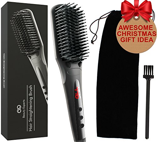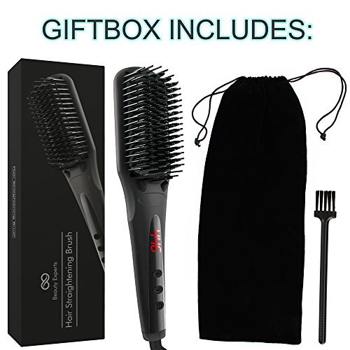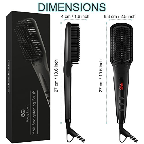 Studio : Beauty Experts Publisher : Beauty Experts Binding : Misc. Product Description The size of the 2-in-1 portable hair straightening brush is 10,5", the handle is 5,5", and the head of the brush is 5". Good solution for travel. Dual Voltage: Pro brush comes equipped with a double ionic generator, which makes your hair silky, frizz-free and easy to manage to get the best natural look hair style. The highest temperature is 450 ℉. You can see it on digital LCD Display. There are 16 heat settings so you can choose a temperature that will be perfect for your hair type: african, brazilian, wavy, curly, long, short. The brush has only three buttons: 1) turn on/off - press for 3 sec to turn the brush on. 2) increase temperature 3) decrease temperature