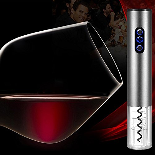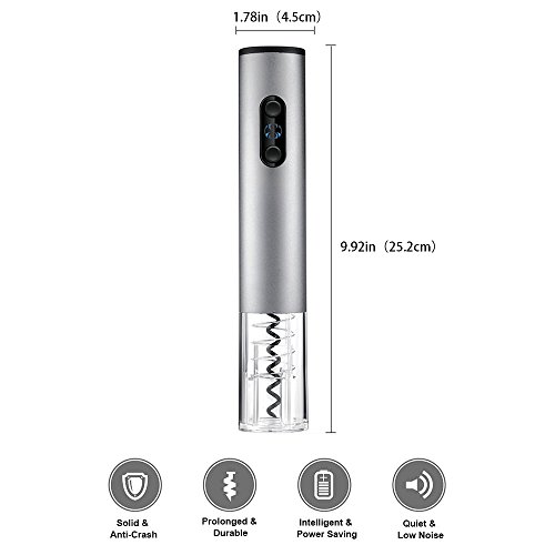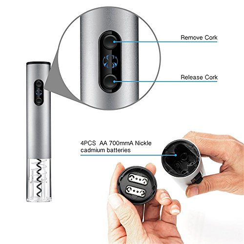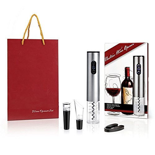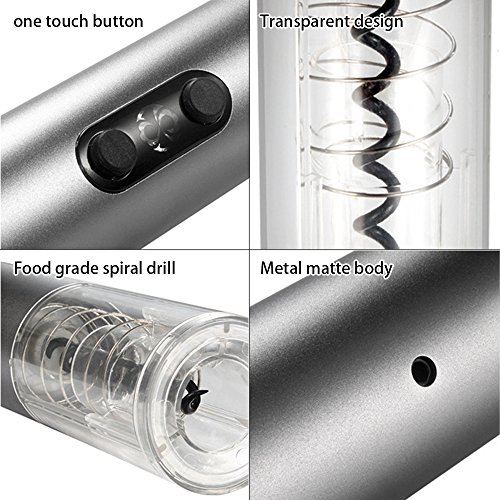-. Feature : ★ Multifunction -- Electric wine opener for removing the cork in seconds with no extra effort. Vacuum stopper for better protecting wine and keeping the wine fresh effect. Pourer help you to pour wine with no leakage. Foil cutter can remove seals covering the cork easily. / ★ Simple to Use -- Simple push button operation, 6 seconds to open the cap, no more effort. It is easy, not rude, keep the grace of men or the elegance of ladies. / ★ Sturdy & Durable -- The corkscrew is made of top quality stainless steel for more strength and flexibility to make sure it can provide a long service time for you. / ★ Battery Powered - Powered by 4 AA batteries (not included), the electric opener can be opened up to 80 bottles of wine at full power. More environmentally friendly, more safety, more efficiently. / ★ Gift Box Packaging -- Exquisite 4-piece set gift box, handbag packaging. The best gift for family, colleague and friends. Family gatherings, business receptions are essential.