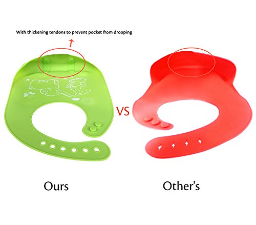 Unique Design - Our silicone feeding bibs are designed with a wide, stay-open pocket and are easily cleaned! With thickening tendons to prevent pocket from drooping. The sturdy, front pocket can catch so much food that kids will sometimes eat right out of it! The wide bib will protect the baby colthes pecfect ; with adjustable 6-buttons, fits children 6 months to 6 years old.