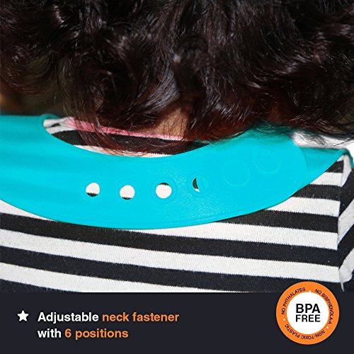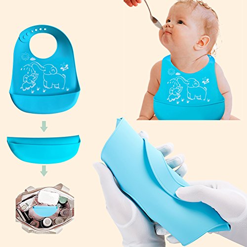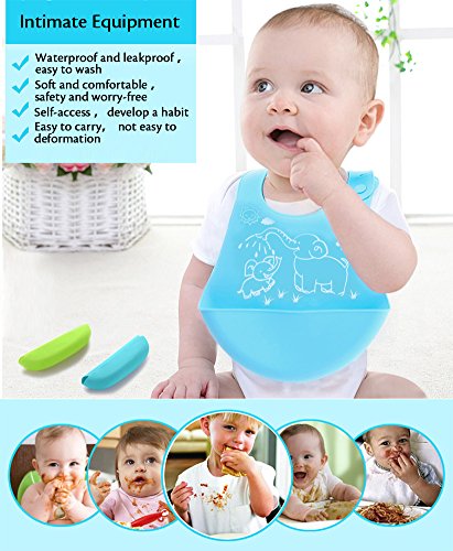 About the product: - Our soft silicone bibs are made with 100% food grade silicone and is naturally waterproof and stain resistant, so it will not soak up water or food!won't hurt tender skin of baby neck,that It will make the baby comfortable; Our baby bibs will make your life easier when it is time to clean up after meals. - No BPA or PVC. Fits children 6 months to 6 years old. - Our silicone feeding bibs are designed with a wide, stay-open pocket and are easily cleaned! With thickening tendons to prevent pocket from drooping. The sturdy, front pocket can catch so much food that kids will sometimes eat right out of it! - Easily to cleans: Rinsed off under running water or cleaned in the dishwasher. - Easy to carry: the soft toddler bib rolls up and stores compactly for use at restaurants or on the go. - Adjustable neckband allows your rapidly growing child to use it for a long time. - Come with 2 pack waterproof bibs: green & blue.