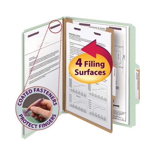 Protect your documents and fingers with Smead's patent pending SafeSHIELD Coated Fastener Technology--the ultimate solution to fastener issues, including paper tears, finger cuts and excessive fastener crinkling. Heavy-duty classification folders make ideal project files. Choose one, two or three dividers. Sturdy Tyvek gusset expands to hold 2 Inches of material.