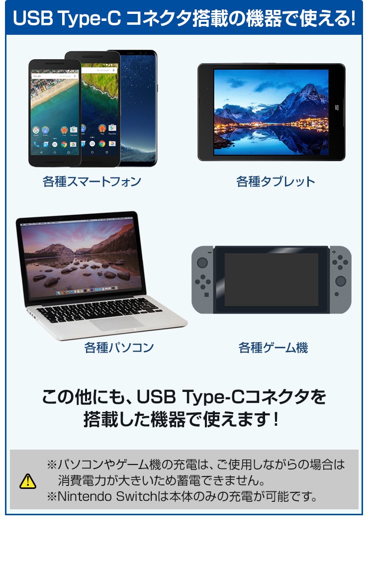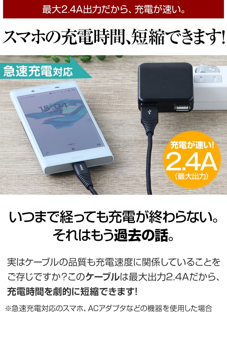 | 注意事項 | ※急速充電2.4Aはご利用環境によって異なります。 ※56kΩの規格に沿っているので、機器を安心してお使いいただけます。 |