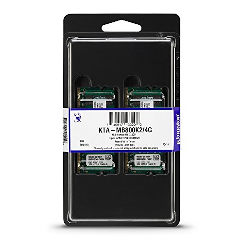 Kingston is the industry leader in PC memory. Included in the package are two 2GB modules of DDR2 iMac and Macbook memory. Product is backed by a lifetime warranty and free technical support. Specs are standard 256M X 64 Non-ECC 800MHz 200-pin Un buffered SODIMM (DDR2, 1.8V, CL6, FBGA, Gold).Feature