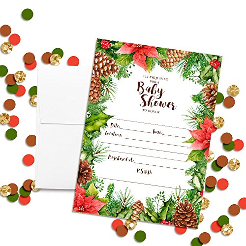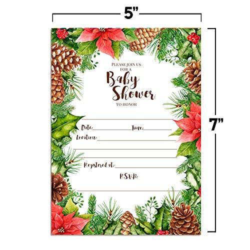 Rustic Poinsettia, Pinecone and Holly Christmas Baby Shower Invitations, Ten 5"x7" Fill In Cards with 10 White Envelopes by AmandaCreation