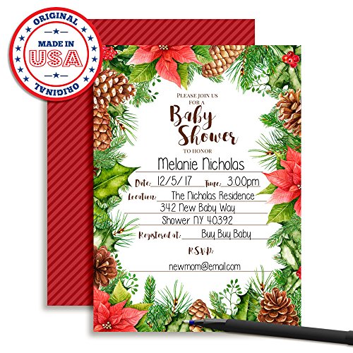 - Stunning Floral Design: Designed by a talented mom, these beautiful cards feature gorgeous poinsettias, watercolor greenery, and pinecones for a gorgeous Holiday Baby shower invitation. The bride to be will love the elegance. ©Amanda Creation. Original design by Amanda Creation™