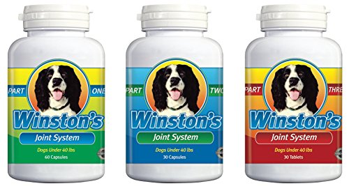 -. Binding : Misc. -. Brand : Winston's -. Color : Green Box -. EAN : 0689076105644 -. Feature : Relieves symptoms of canine hip dysplasia / Relieves symptoms of arthritis and pain / Reduces stiffness and inflammation / Since 1990, we have helped over 20,000 dogs from all over the world / Made in the U.S.A. - Completely drug free -. Label : Winston's -. LegalDisclaimer : HEALTHY PETS DISCLAIMER: This information is for educational purposes only and is not intended to replace the advice of your own veterinarian or doctor. Your pet's medical protocol should be given by your holistic veterinarian. -. Manufacturer : Winston's -. Model : WJSU35 -. MPN : WJSU35 -. PackageQuantity : 1 -. PartNumber : WJSU35 -. ProductGroup : Pet Products -. ProductTypeName : PET_SUPPLIES -. Publisher : Winston's -. Size : Small -. Studio : Winston's -. Title : Winston's Joint System - For Small Dogs Under 35 Pounds - 100% Natural Whole Food Supplement System for Canine Arthritis, Hip Dysplasia and Joint + Pain Relief - One Month Supply (Under 35 Lbs) -. UPC : 689076105644