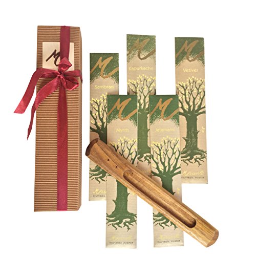 PREMIUM INCENSE STICKS, AYURVEDIC AROMATIC INCENSE GIFT SET BOX CONTAINS 5 TYPES OF INCENSE STICKS (JATAMANSI, KAPURKACHURI, MYRRH, VETIVER, AND SAMBRANI) AND A WOODEN STICK HOLDER. Great GIFT IDEA
