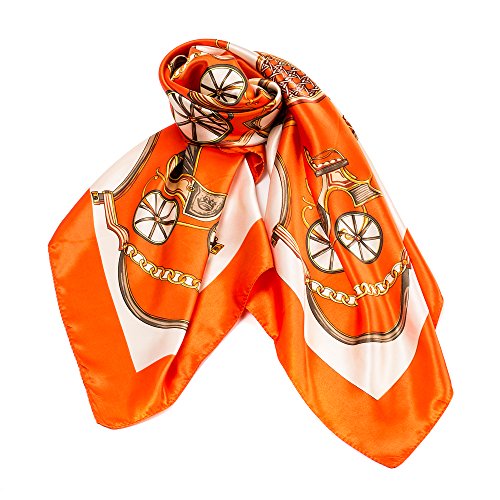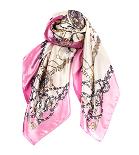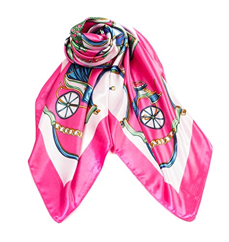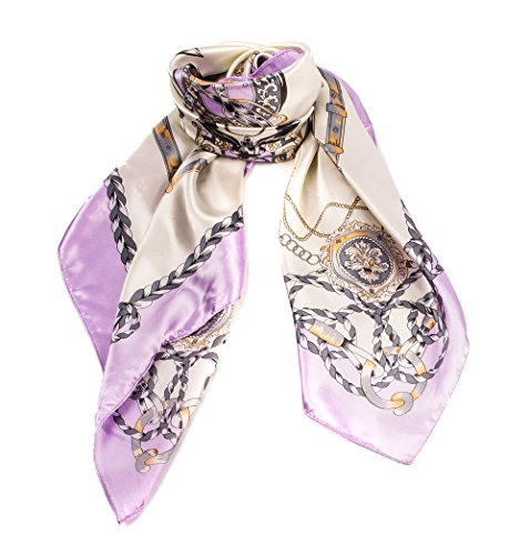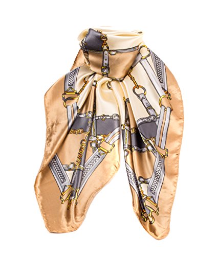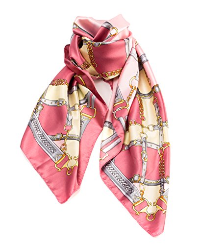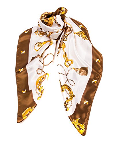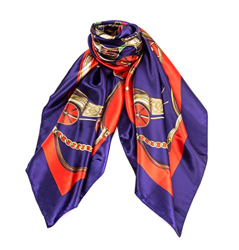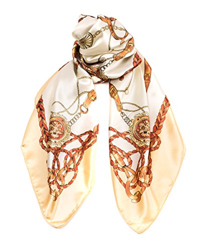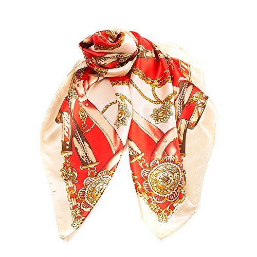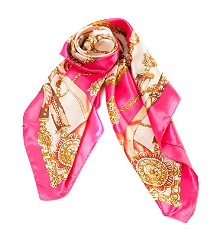 Product DescriptionBeautiful Womens Fashion scarf On trend accessory High quality silk feel finish shawl Baroque style Various colourful designs with chains, carriages, belts, straps and jewels Size: 90cm x 90cm0