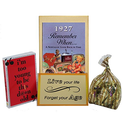 -. Binding : Misc. -. Brand : Jubilee Celebrations by Wellhaven -. EAN : 0815659013765 -. Feature : 90th birthday gift for men or women / Includes 24-page 1927 trivia booklet, caramel candy, / a sign that reads: "Live your life - forget your age" / and a book of funny quotes about getting older. / Presentation box is a reusable gift box or keepsake box -. IsAdultProduct : 0 -. Label : Jubilee Celebrations by Wellhaven -. Manufacturer : Jubilee Celebrations by Wellhaven -. PackageQuantity : 1 -. ProductGroup : Grocery -. ProductTypeName : GROCERY -. Publisher : Jubilee Celebrations by Wellhaven -. Size : 6" wide x 10" high -. Studio : Jubilee Celebrations by Wellhaven -. Title : 90th Birthday Gift Basket Box - Live Your Life - with 1927 Trivia Booklet -. UPC : 815659013765