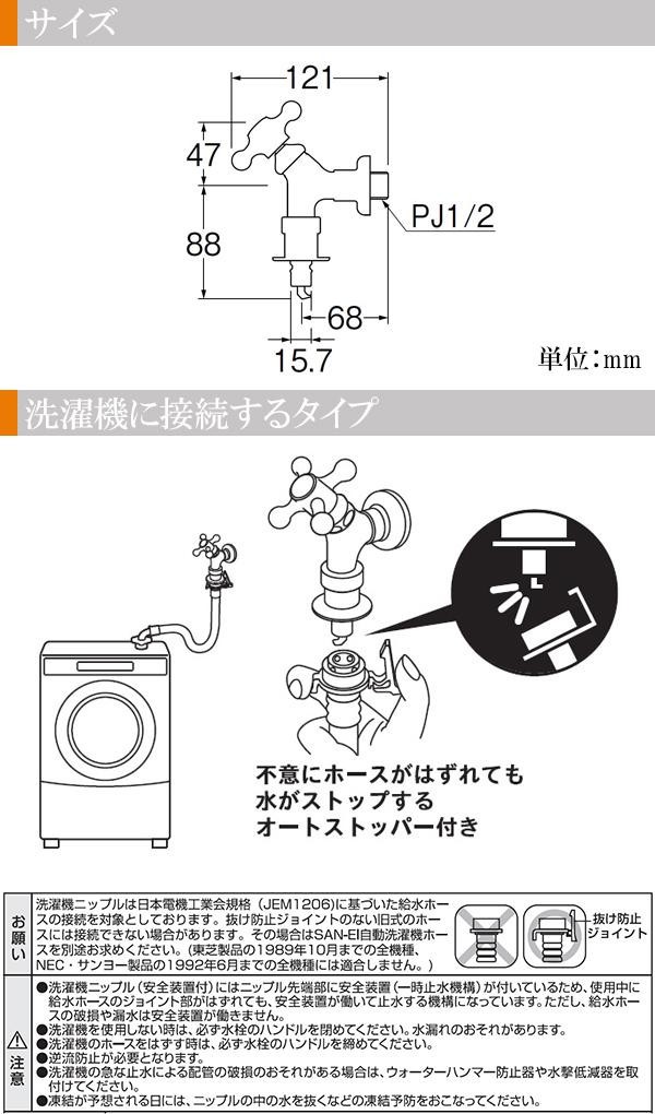使いやすいクロスハンドルの洗濯機用送り座水栓です。ホースが外れても水がストップするオートストッパー付きです。