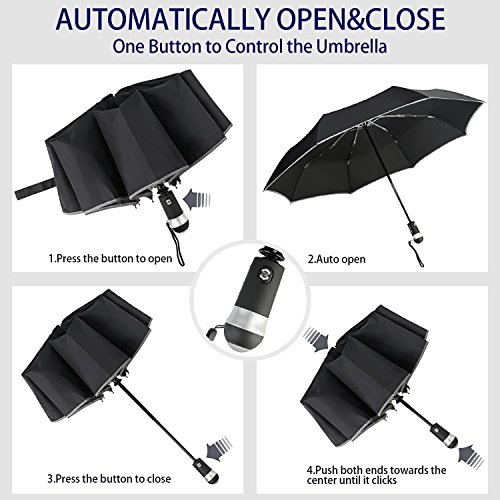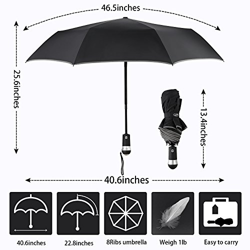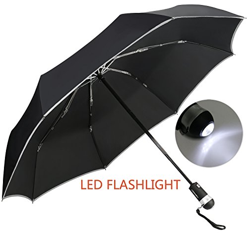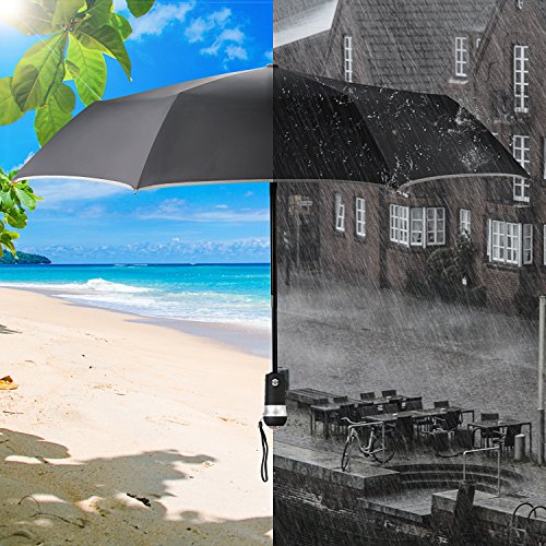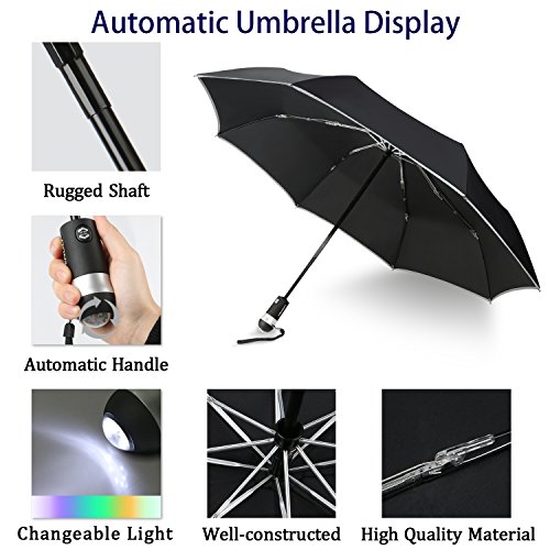 -. Feature : ★LIGHTWEIGHT, COMPACT & AUTOMATIC: This Sun &Rain travel umbrella weights less than 1lb and its folding length is 13 inch. It is easy to carry and storage in backpacks, purses, bags, briefcases, luggage and more. Auto open and close function allows for easy one-handed operation / ★UNIQUE HANDLE: The compact rain umbrella keeps you safe and dry. Press the button softly, walk at the rainy night safely. When camping or get lost, the LED light handle could show you the way or you could ask for help by SWITCHING the COLORs of the light / ★REFLECTIVE STRIP SAFETY DESIGN: The foldable umbrellas have reflective strips on the edge of the umbrellas. The humanization design prevents you from car danger when you cross the roads or stroll on the streets in the dark. It is a considerate choice for men, women, boys, girls, ladies and kids / ★SUPERIOR & QUALITY MATERIALS: The portable umbrella is well crafted of protective and waterproof fabric, which increases durability and strength. The travel UV protection umbrella is great for watching sports matches / ★DURABLE & STURDY CONSTRUCTION: This folding umbrella is extra large. 8 aluminum ribs construction is solid, avoiding the umbrella turning inside out when on the beach. It is perfect when stormy rain, howling gale or heavy wind