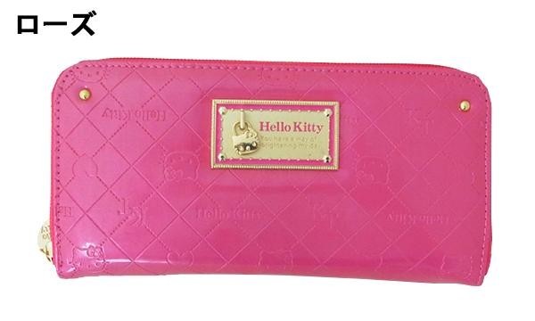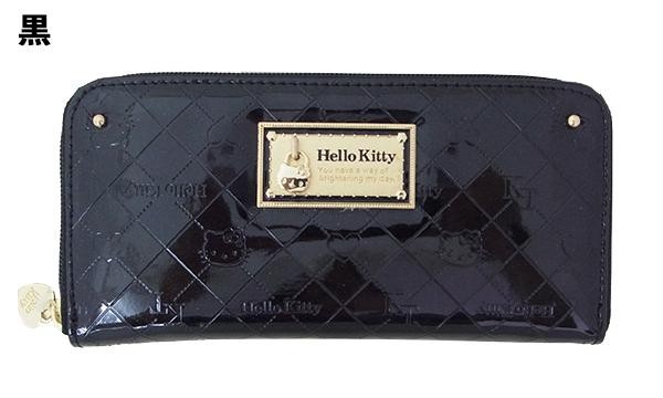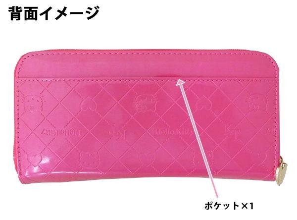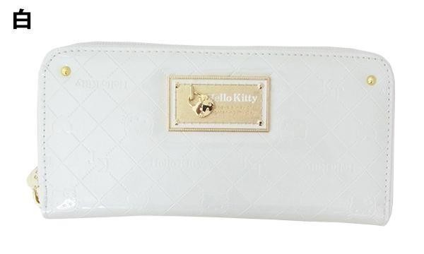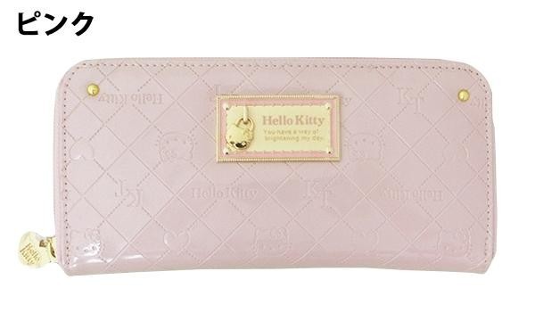 エナメル調の合成皮革に、キティちゃんのモノグラムが型押しされた長財布です。カードホルダー、ファスナー式小銭入れ、背面ポケットなど使いやすい機能がたくさん♪本体前面にあしらわれたゴールドのロゴと、ゆらゆら揺れるキティちゃんのチャームがとってもキュート♪自分用はもちろん、プレゼントにもおすすめです☆ |