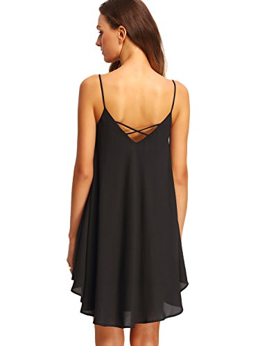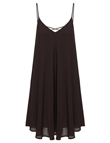 V neck, sleeveless, criss cross back, unadjustable spaghetti strap, flare bottom, lined.
