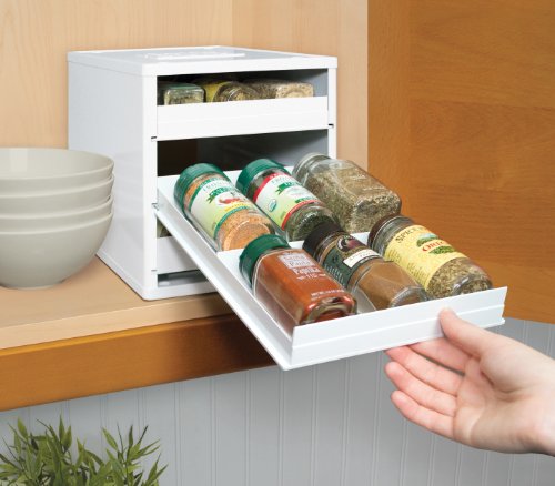 - Feature : NEW 2014 MODEL - Store and organize 18 full-size or 36 half-size spice bottles (not included) / Three drawers pull out and lower to display spices in full view for easy location and reach; New universal drawer design holds both round and square bottles / Compact unit saves valuable counter/cabinet space / Includes 96 (48 printed, 48 blank) removable drawer labels for custom organization / Fits into standard cabinets; Measures 8-11/16" H x 10-15/16" D x 8-1/16" W