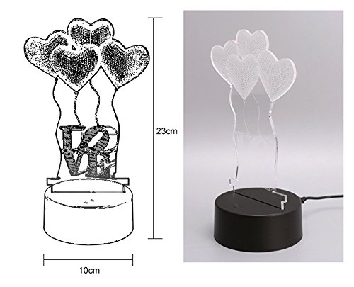 -. Feature : 100% brand new and high quality This unique and charming LED 3D visual night light will be a excellent and romantic gift for your friend and yourself Unbelievable, only use a 2D acrylic piece to create a attractive 3D stereoscopic visual pattern and lighting effects, seems vivid and full of personality, good illumination effect and full of creativity / Laser engraving acrylic piece only 5mm thickness, but deliver magical 3D illumination, convenient and useful, easy to use Not only 3D stereoscopic illumination, but also show your colorful lighting effect, touch switch to control the lighting color, seven colors and one gradient color for you to choose just touch the switch key on the ABS base / High quality LED light source, low power consumption, long working lifespan, matching with acrylic light guide plate, bring you soft but bright enough illumination effect, no dazzling and high temperature exists, safe to use Suitable for desktop lamp, bedside lamp, suitable for baby room, corridor, etc. Notice: the both sides of acrylic light guide plate have protective membrane, please tear them down before usage