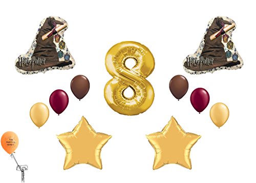 -. Feature : 2 ~ Gold Star Mylar Balloons / 1 ~ #8 Gold XL Latex Balloon / 2 ~ Harry Potter Hat Mylar Balloons / 2 ~ Burgundy Latex Balloons / 2 ~ Gold Latex Balloons. 2 ~ Brown Latex Balloons / 1 BONUS The Party Is Here Latex Balloon (colors vary) NO helium included