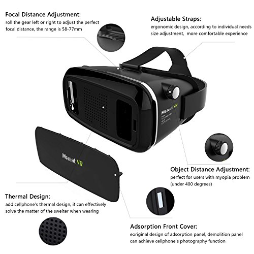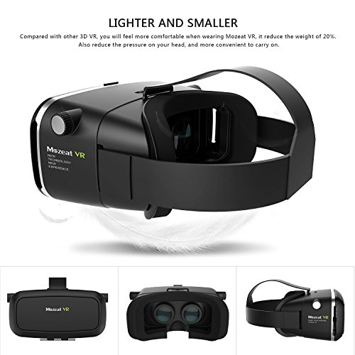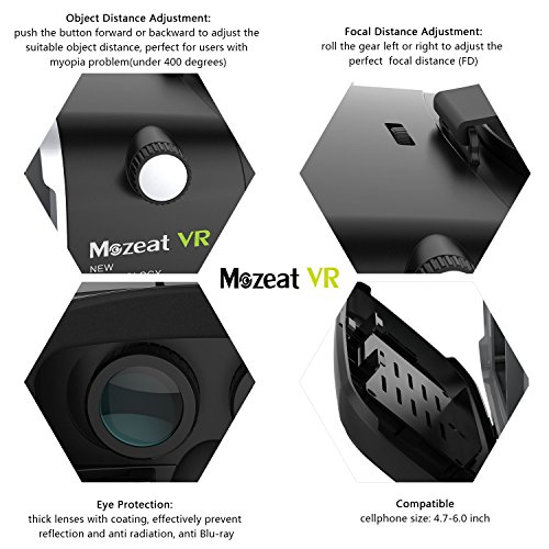 -. Binding : Electronics -. Brand : Mozeat Lens -. EAN : 0726630723330 -. Feature : TURN YOUR SMART PHONE INTO A 3D DEVICE. You can watch 3D movies & play 3D games. Mozeat VR is the use of 3D technology to create a simulated environment. Unlike traditional user interfaces, Mozeat places you inside an experience. Instead of viewing a screen in front of them, you are immersed and able to interact with 3D. / PRO 3D VIEWER GLASSES. BEST GIFT CHOICE. Sophisticated image color compensation technology to improve your visual experience. Imported precision lens supports the application of ultra high definition imaging technology. Professional design will not let you feel visual fatigue and dizzy. / HUMAN BODY BIONICS DESIGN. The T-shaped straps make it adjustable for different people. Its design can also help decrease the pressure on around your eyes so you will feel much more comfortable when enjoy the movie or game; Simulating Viewing Distance: Offer you a 1000 inches big screen at the distance of 3m; Offers you super 3D picture effect and wonderful feeling. / PUPIL DISTANCE (PD) AND FOCAL DISTANCE (FD) ADJUSTABLE. PD and FD can be adjusted for the best experience, PD range: 55mm - 75mm. The surface of this 3D VR glasses is matte and it also uses a high-definition optical resin lenses. It is perfect for people with myopia under 600 degreed. / COMPATIBLE WITH MOST MOBILE PHONES:Fits for iOS, Android and Windows phones with screen size within 6.0 inch, recommended phone size is 4.0 to 6.0 inch, such as Samsung Galaxy Note 4/Galaxy Note 3/ Galaxy S6 Edge/Galaxy S6/iPhone 6s/iPhone 6/iPhone 6 Plus/iPhone 5c/iPhone 5s/iPhone 5/LG G3/SONY Xperia Z3+/HTC One Max/ Desire 816/One M9/ASUS Zenfone 2 etc. -. Label : Mozeat Lens -. Manufacturer : Mozeat Lens -. MPN : VR-2 -. PackageQuantity : 1 -. PartNumber : VR-2 -. ProductGroup : Speakers -. ProductTypeName : CE_ACCESSORY -. Publisher : Mozeat Lens -. Studio : Mozeat Lens -. Title : Mozeat Lens VR Virtual Reality Headset 3D Glasses -. UPC : 726630723330