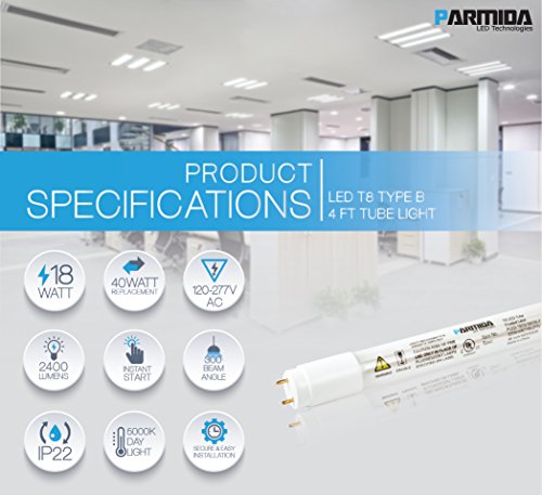 (20-Pack) Parmida LED T8 Light Tube, Type B, 4FT, 18W (40W Equivalent), 2200lm, UL-Listed for Single & Dual-Ended Connection, Ballast Bypass, Shatterproof, UL, DLC (20-Pack, 5000K)