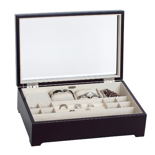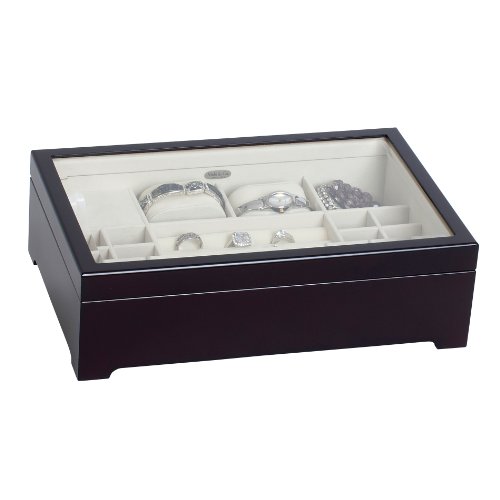 -. Feature : Glass lid and java finish / Sleek no-hardware design / Plays magic flute / Ring rolls plus open and divided storage / Two padded watch cushions