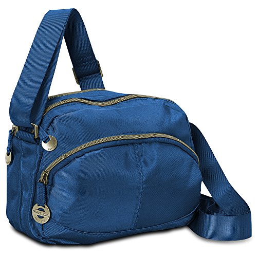The Travelon Twill Crossbody with RFID Protection has many great features. Not only does it have two main compartments and several pockets, but it also has a hanging LED light to help you find your things in the dark and RFID protection that prevents unauthorized access to personal information.