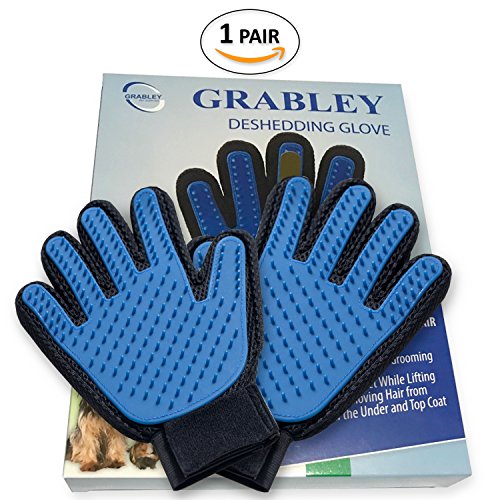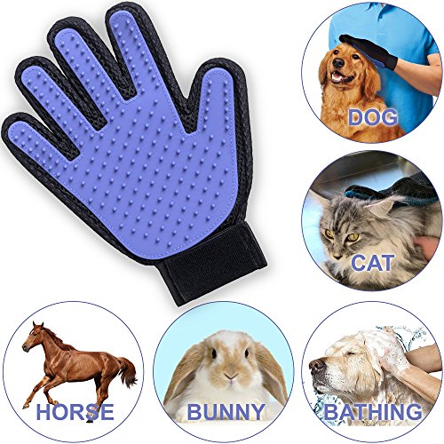 Daily pet brushing and massaging, de-tangle matted fur, put that finishing shine on coats, nylon mesh liner is fast drying and water resistant, gentle rounded silicone tips, adjustable wristband for a comfortable fit, easy to clean your pet will love the Grabley five finger deshedding glove.