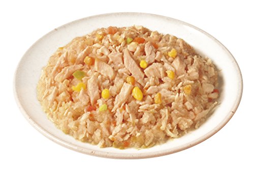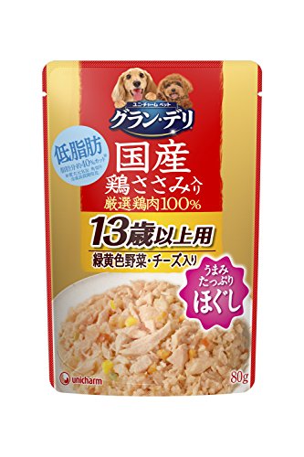 原材料:肉類(鶏胸肉、鶏ササミ、チキンエキス)、野菜類(ニンジン、グリンピース、トウモロコシ)、チーズ、しょうゆ、増粘多糖類、塩化カリウム、酸化防止剤(EDTA-Ca・Na)、ビタミン類(B1、B2、B6、B12、C、E)、グルコサミン、コンドロイチン