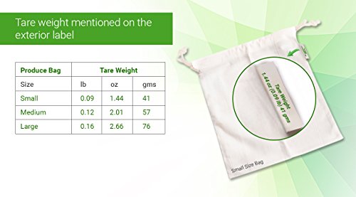 - Set of 3 Small Produce Bags with flat tangle-free drawstring; Tare weight sewn on the exterior label to make checkout credit easy