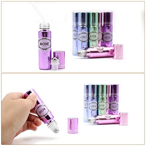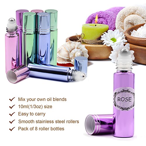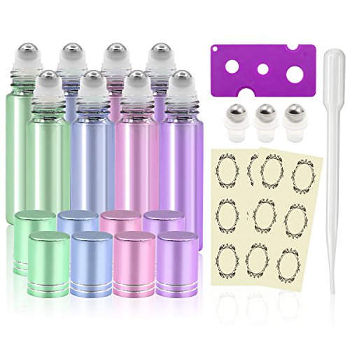 Pack of 8, 10ml Glass Roll on Bottles with Stainless Steel Roller Balls for Essential Oil-- Include 3 Extra Roller ball, 12 Pieces Labels, Essential Oils Opener, 3ml Dropper