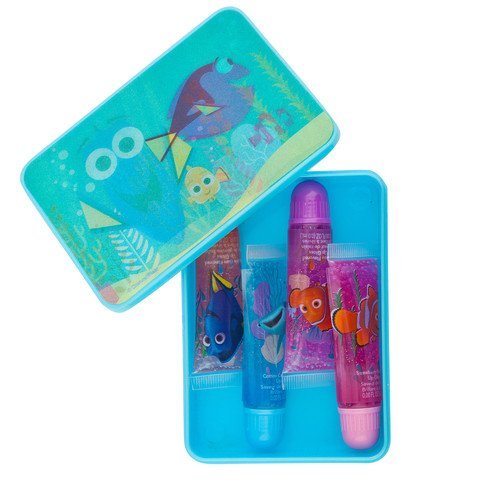 -. Feature : SHIMMER AND SHINE This super cool lipgloss set makes lips sparkle and shine, while hydrating and protecting. It is the perfect shimmery lip balm. / FINDING DORY CHARACTERS Each lipstick and the carrying tin are decorated with different Finding Dory characters. Kids will have fun showing their friends this colorful collection. / PUCKER UP WITH YUMMY FLAVORS Children will have a great time trying out all the amazing flavors, and there is sure to be something for everyone. Set includes: Bubble Gum, Grape, Strawberry and Cotton Candy. / PERFECT PRESENT FOR BIRTHDAYS AND HOLIDAYS Whether it is her birthday, Christmas, or any other day, this set will make a great gift for any girl on your list. / AGES 3 AND UP This kit of lip balm glosses is recommended for children ages 3 and up.