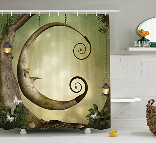 Ambesonne Cartoon Decor Collection, Forest Secret Swing Old Tree Curly Half Moon Shaped Lamps and Butterflies Lights Image, Polyester Fabric Bathroom Shower Curtain Set with Hooks, Khaki Olive