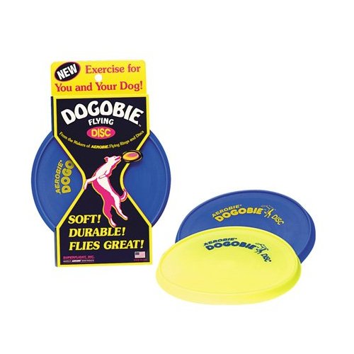 The 8" AEROBIE Dogobie Disc is made with a flexible, but tear and puncture resistant material and is gentle on your dog's mouth and teeth but sturdy enough to endure fetch after fetch. With its patented spoiler rim design, the Dogobie disc is made for long, stable flights even when thrown by a beginner. Floats in water! Quality made in the U.S.A.