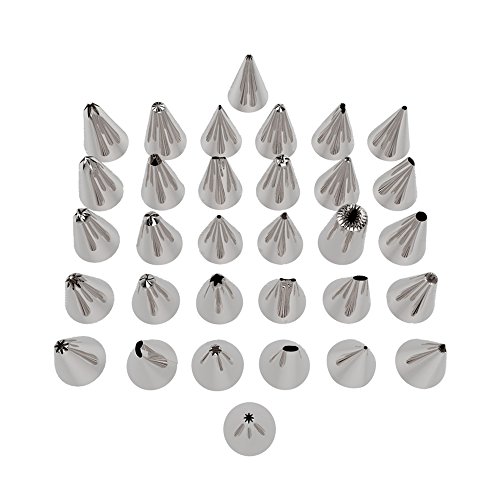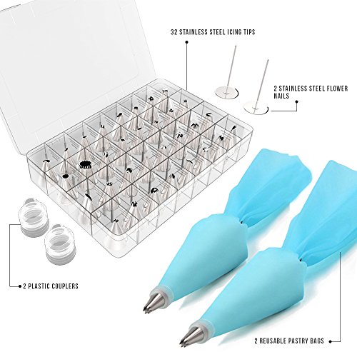 - The set includes 32 pieces of icing tips, 2 pieces of pastry bags, 2 pieces of flower nails and 2 pieces of coupler; all these can be used to create very exciting and different patterns on any cake