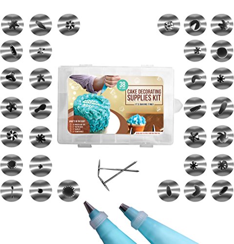 Cake Decorating Supplies Icing Piping Tips - 38-Piece Stainless Steel Frosting Kit - 2 Sizes Reusable Pastry Bags, Flowers Nails, Couplers, and A Storage Box - Baking Tools Supply - by Utopia Kitchen
