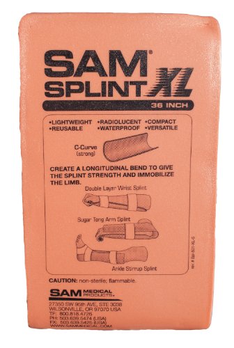 Sawyer's first aid 36-inch long SAM splint helps protect and immobilize injured extremities such as arms and legs. The lightweight 4 ounce, compact and easy to transport SAM splint affixes to injured limbs with any tape or wrap. Built from a thin core of aluminum alloy and sandwiched between two layers of closed-cell foam, the SAM splint bends into any of three simple curves to give the splint strength and immobilize a fractured or injured limb. The SAM splint is extremely moldable and soft enough to cut with ordinary household scissors. Radiolucent splint can remain taped to injured extremity during X-rays. The waterproof splint is easy to clean and re-shapeable for multiple reuses.Feature