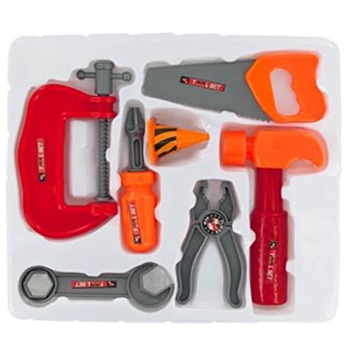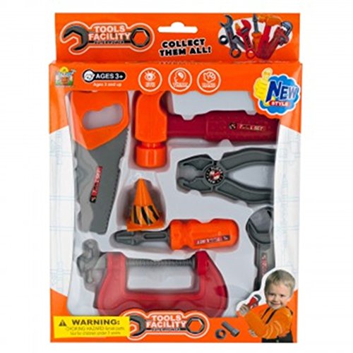 Product Description Great for hours of fun and learning hand-eye coordination, this Kids Tool Play Set features an assortment of colorful mini plastic tools and hardware. Set may include: pliers, wrenches, a saw, drill, hammer, screwdriver, a nut, bolt, clamp, safety cone and more. For ages 3 and up. Comes in assorted styles. Comes packaged in an individual hanging window box. Box measures approximately 8" x 1.5" x 10.5". 0